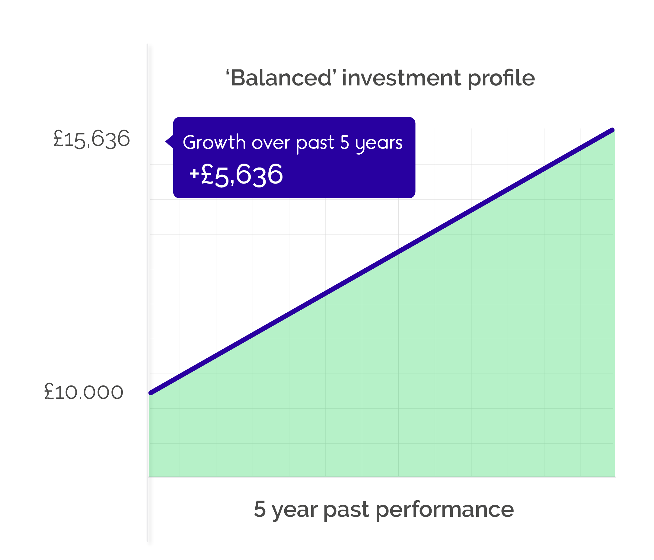 If you had invested £10,000 in the ‘balanced’ investment profile 5 years ago, your pension would now be worth £15,636 (that’s 56.4% growth over 5 years).